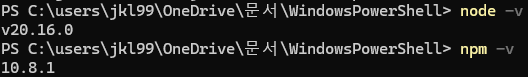 node.js가 제대로 설치된건지 확인하기 위한 node -v 와 npm -v 명령어.